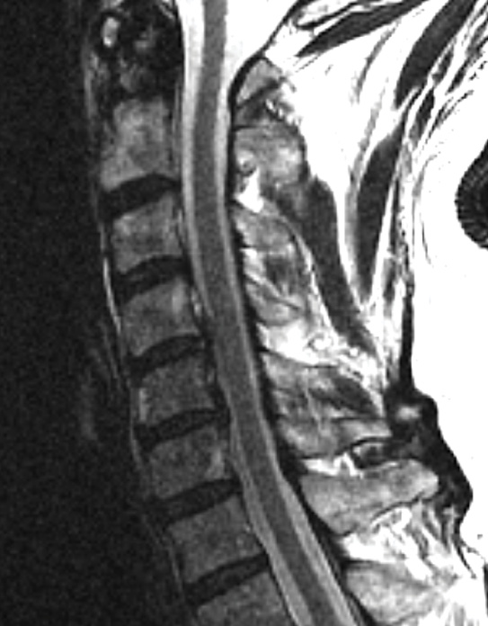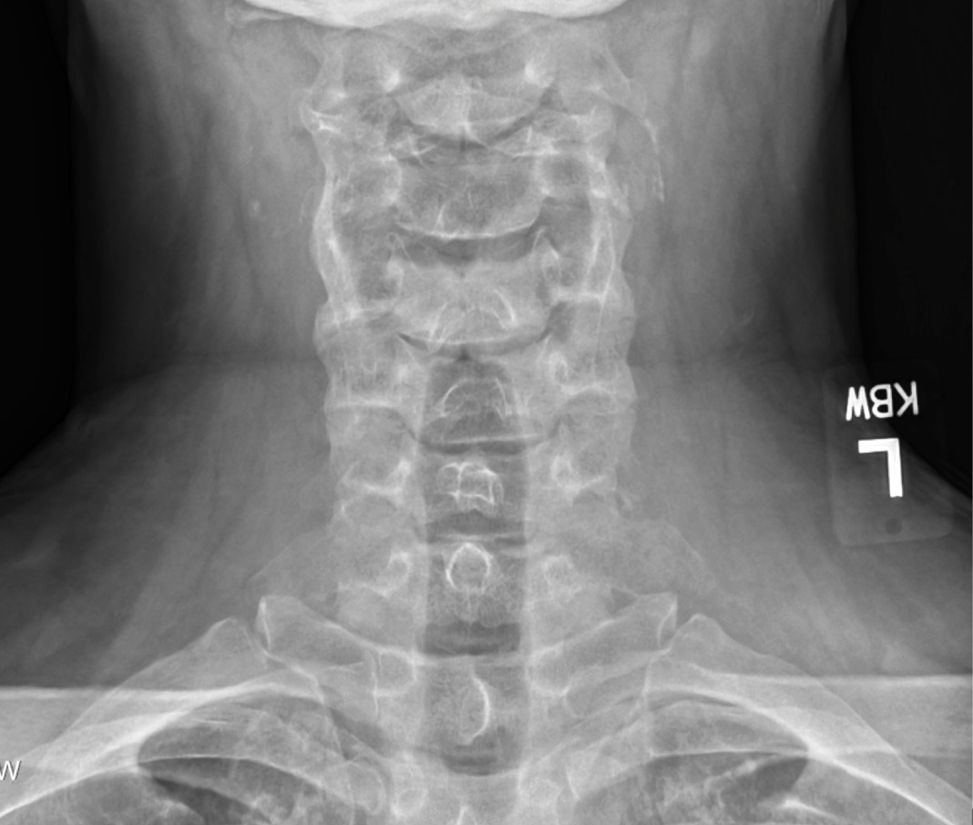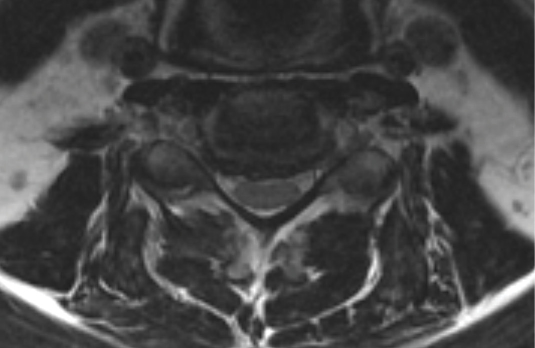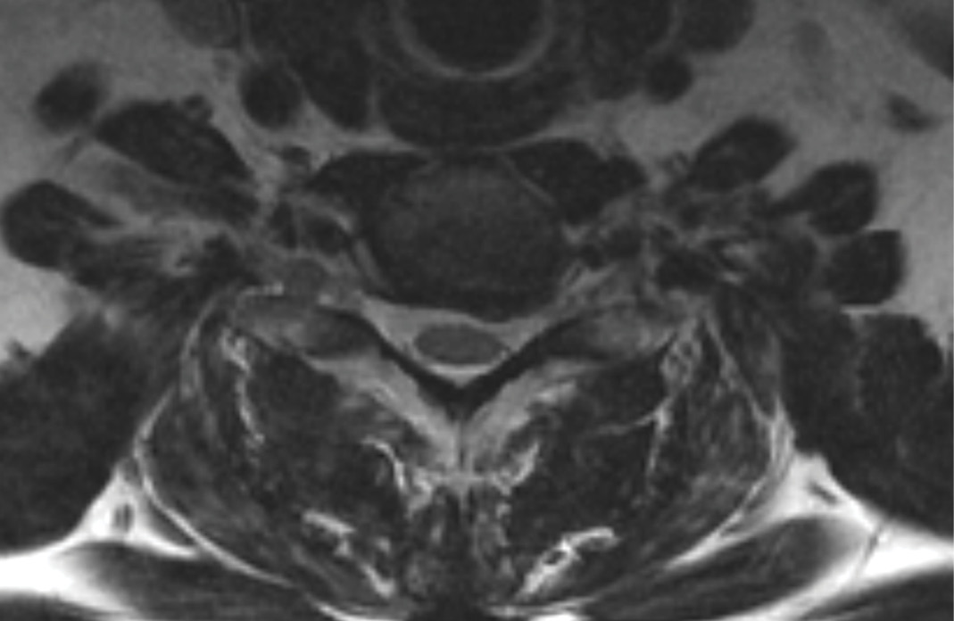 MRIs illustrated mild degenerative disc disease from C4-6 with disc herniations at both C4-5 and C5-6. The axial slice through C4-5 showed a right central disc herniation causing central and mainly right-sided foraminal stenosis. The axial slice through C5-6 showed a central disc herniation also causing central and mainly right-sided foraminal stenosis. The axial slice through C6-7 showed a left-sided disc herniation causing some left-sided foraminal stenosis, however, the patient did not demonstrate any left-sided symptoms.
