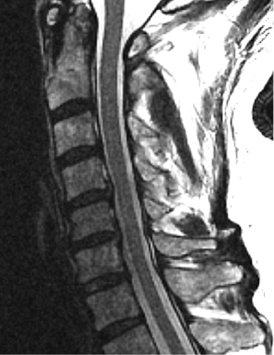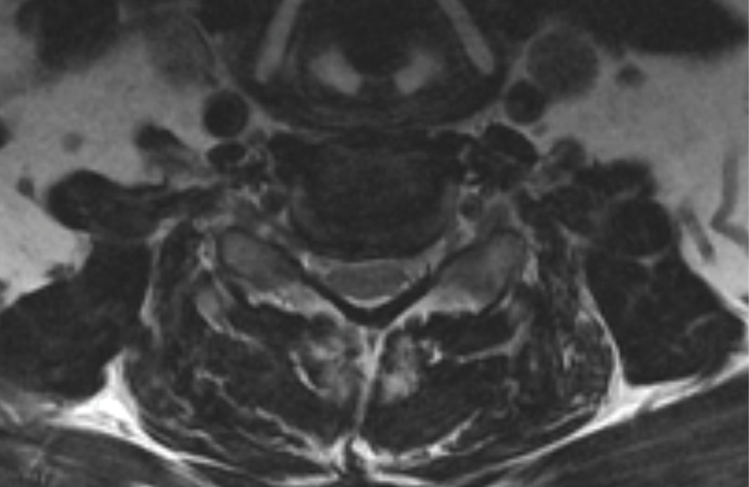 MRIs illustrated mild degenerative disc disease from C4-6 with disc herniations at both C4-5 and C5-6. The axial slice through C4-5 showed a right central disc herniation causing central and mainly right-sided foraminal stenosis. The axial slice through C5-6 showed a central disc herniation also causing central and mainly right-sided foraminal stenosis. The axial slice through C6-7 showed a left-sided disc herniation causing some left-sided foraminal stenosis, however, the patient did not demonstrate any left-sided symptoms.